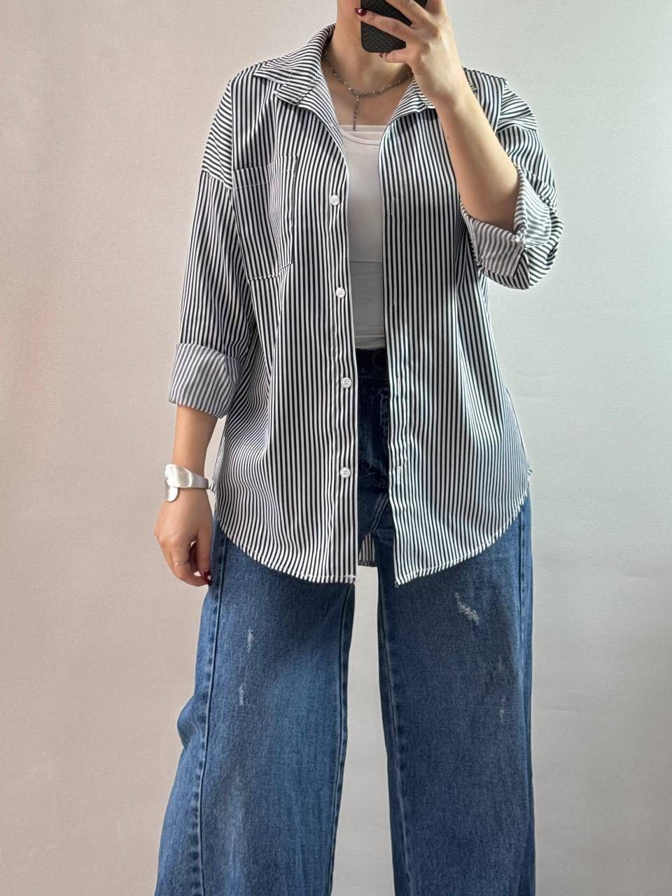 شومیز مانتویی راه راه ساتن راه راه فری سایز
